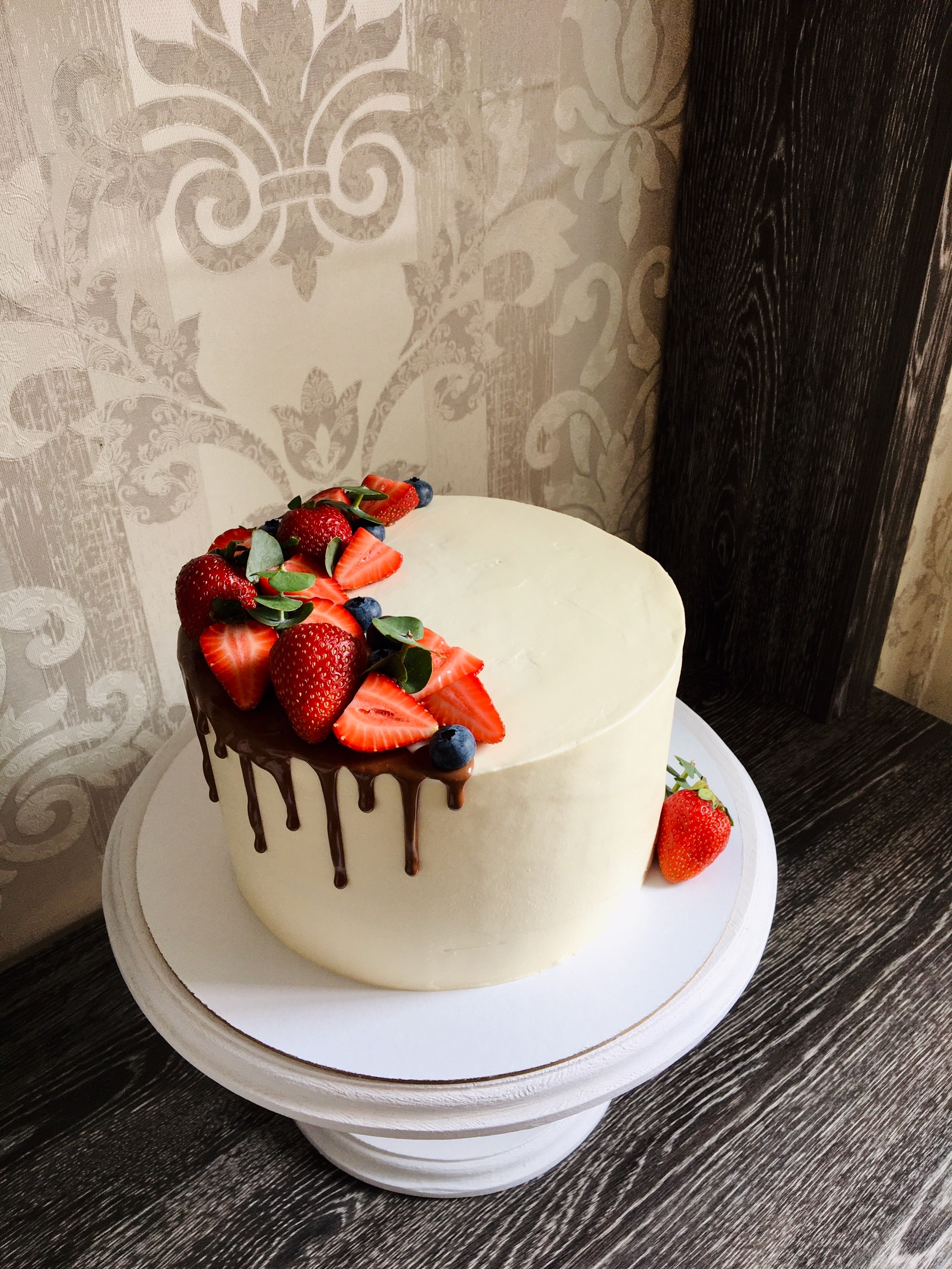 Шоколадный бисквит, сливочный крем, ганаш на белом шоколаде с манго, ганаш на белом шоколаде с клубникой, конфи из клубники.