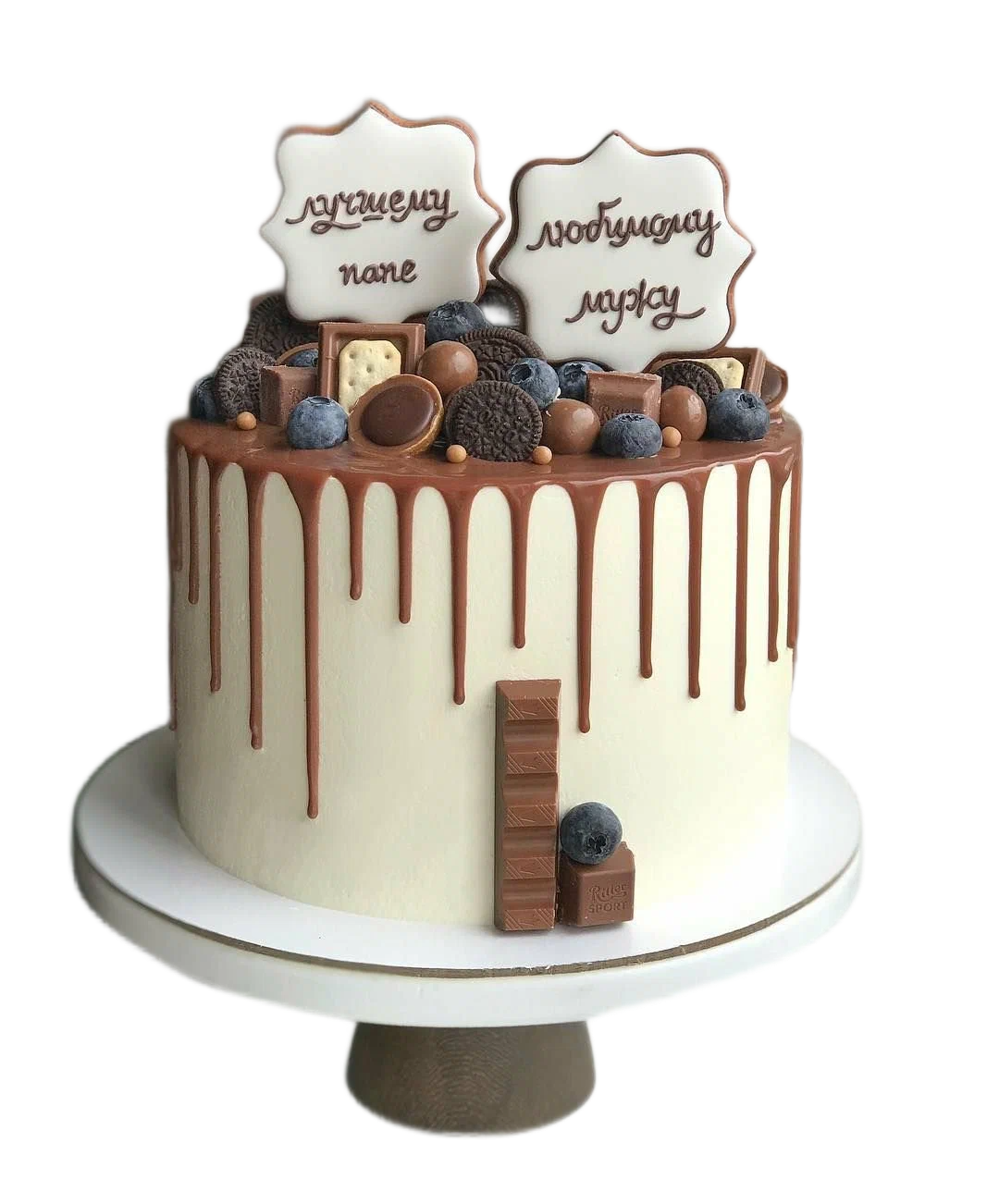 Шоколадный бисквит, сливочный крем, ганаш на белом шоколаде с манго, ганаш на белом шоколаде с клубникой, конфи из клубники.